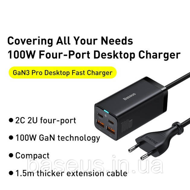 Baseus GaN3 Pro 100W (2 Type-C + 2 USB) — мережевий зарядний пристрій високої потужності, який здатний заряджати 4 гаджети одночасно.
